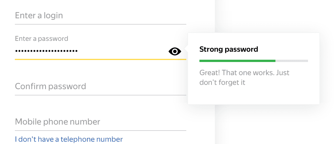 • パスワードが一定以上の長さなら緑色、ある程度の長さなら黄色、短いようであれば赤色にバーの色を変えましょう。